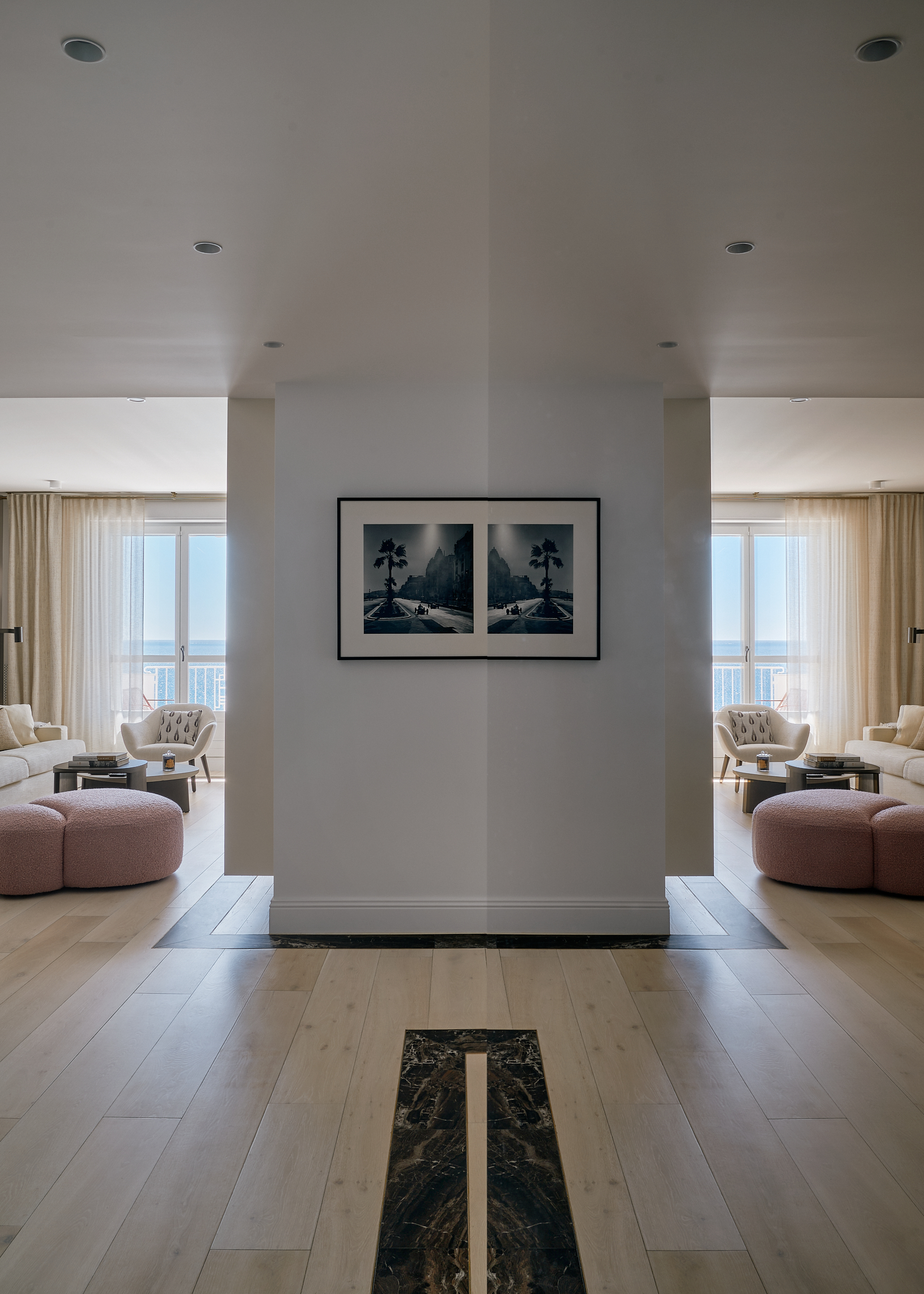 Promenade des Anglais üzerinde, denize birinci sırada konumlanan bu daire, sahip olduğu potansiyeli ortaya çıkarmak ve Akdeniz’e açılan eşsiz manzarasını vurgulamak amacıyla tamamen yenilenmiştir.